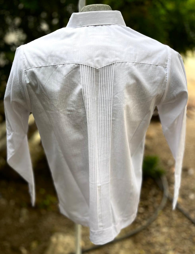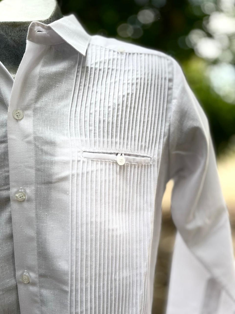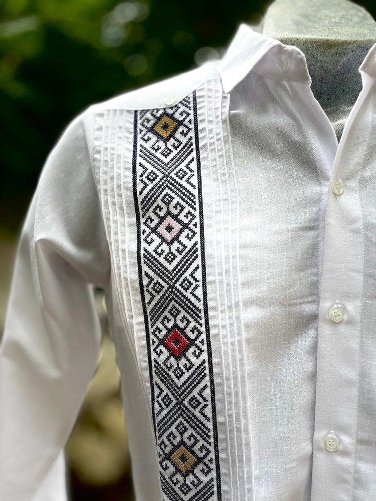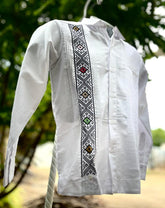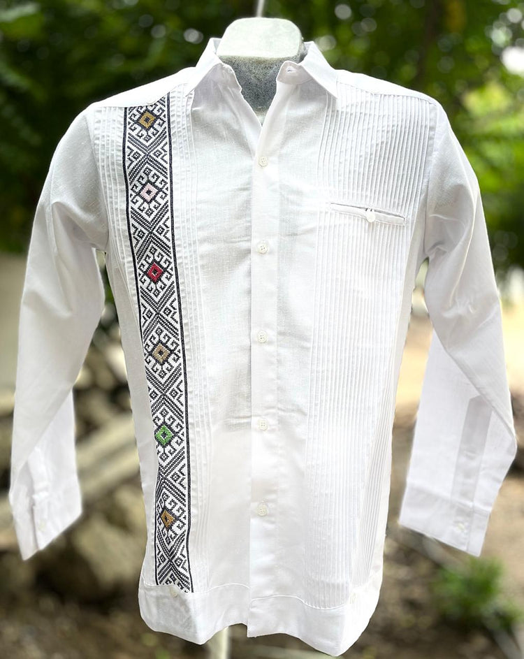 Elegancia y tradición en una sola prenda. Esta guayabera blanca de manga larga está confeccionada en tela fresca y ligera, ideal para cualquier ocasión formal o casual. Su diseño destaca por finas alforzas al frente y un bordado artesanal en tonos negro, verde, amarillo y rosa, que aporta un toque único y culturalmente auténtico.